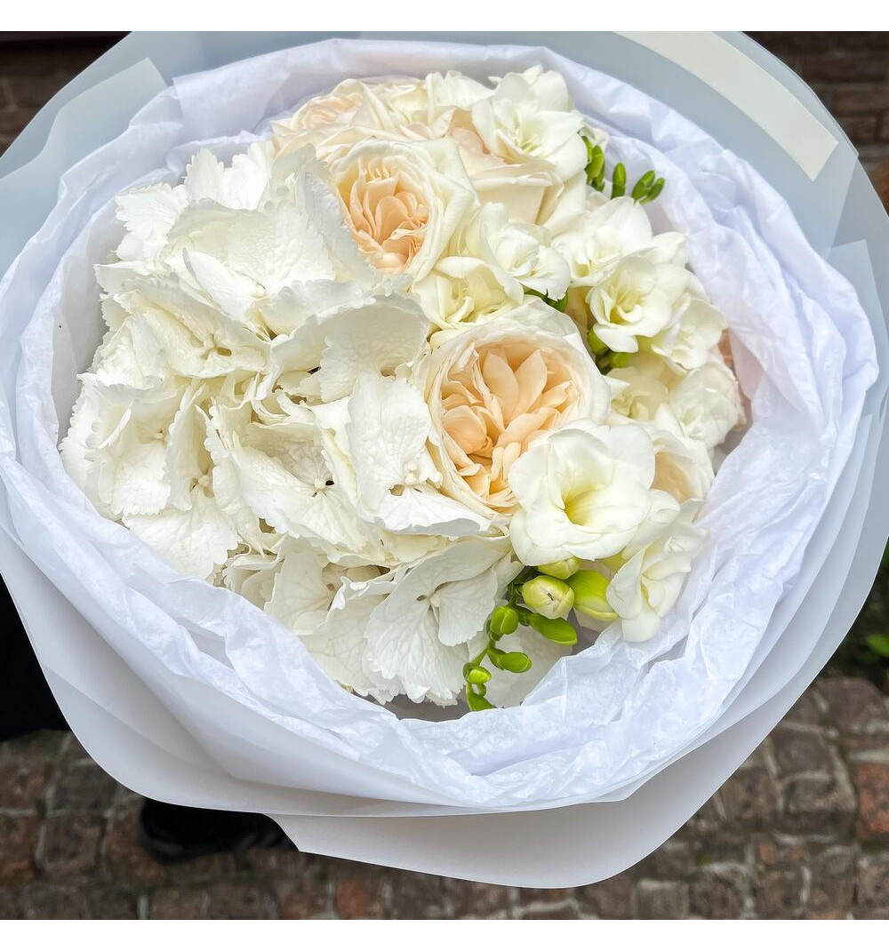 В этом букете прекрасно сочетаются 1 нежная белая гортензия, символизирующая изобилие и благополучие, и 3 белых фрезии, которые добавляют нежности и изящества. 5 роз сорта White O'Hara приносят в букет нотки роскоши и романтики. Букет украшен репсовой лентой, дизайнерской упаковкой, а также фирменной биркой и наклейкой, что делает его уникальным и восхитительным подарком. Подарите этот авторский букет, чтобы создать незабываемые впечатления и подчеркнуть особенность момента для вашего особенного получателя.