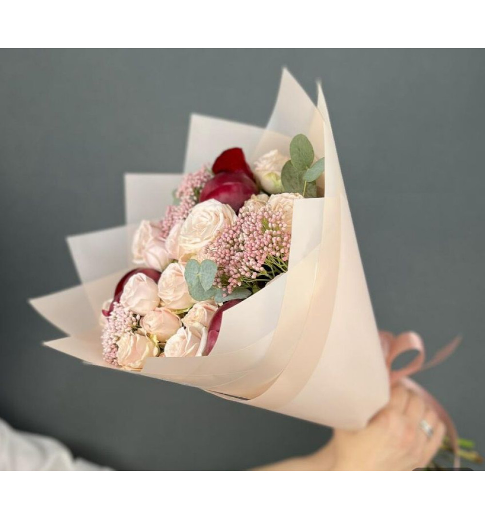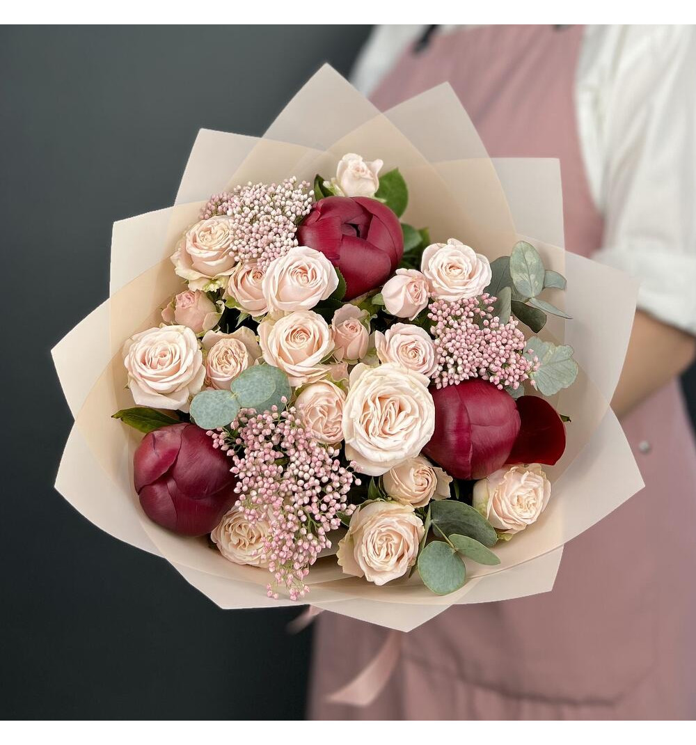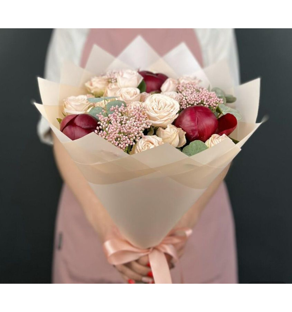 Купить Авторский букет из красных Пионов и кремовых кустовых Роз с Озотамнусом в Есиле за 20 000 ₸ | интернет-магазин «Guls»