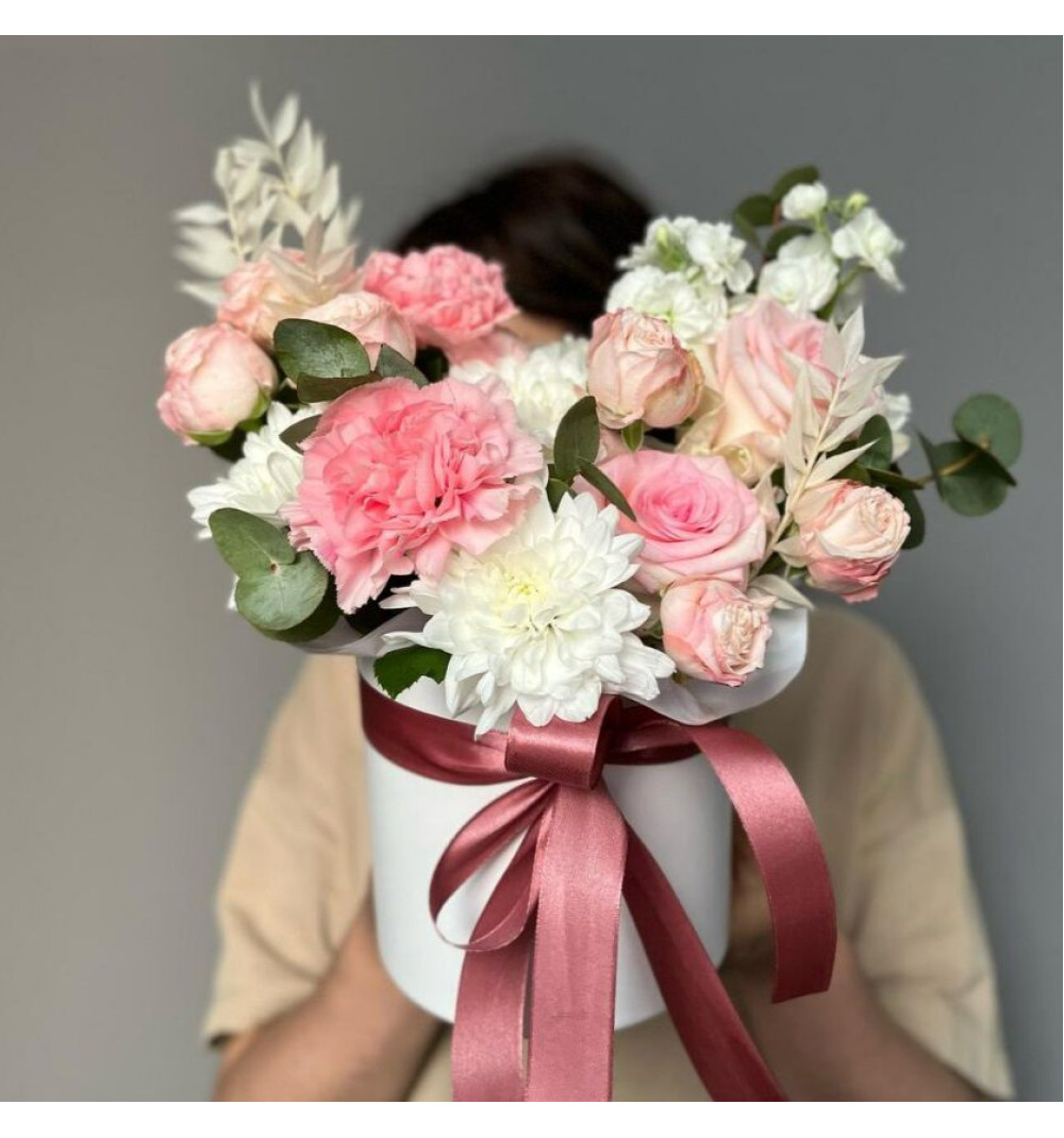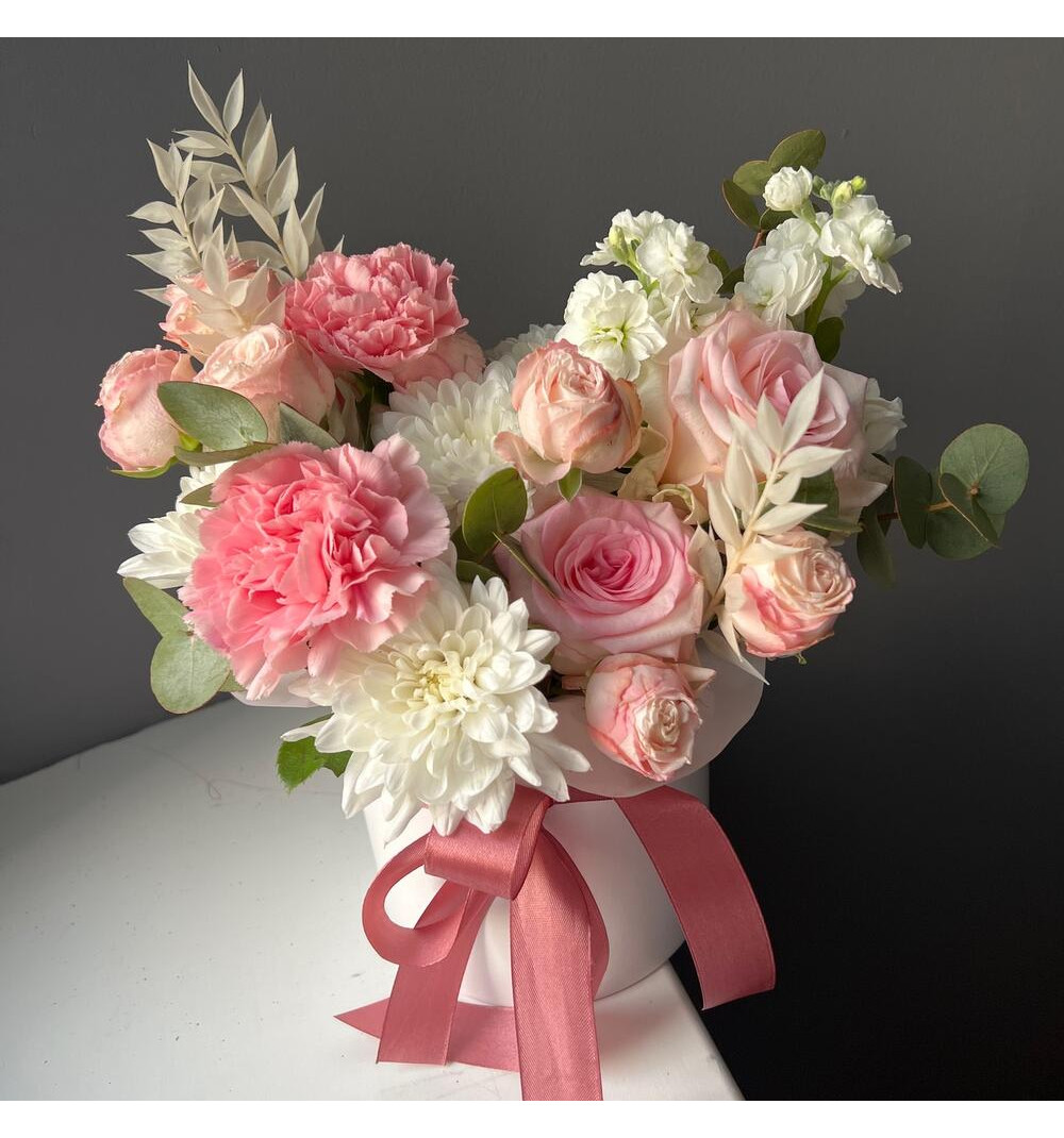 Купить Кустовые пионовидные розы, маттиола и хризантема в шляпной коробочке в Есиле за 15 000 ₸ | интернет-магазин «Guls»