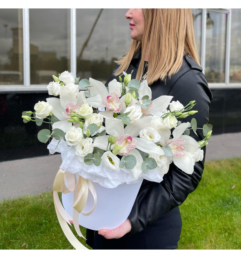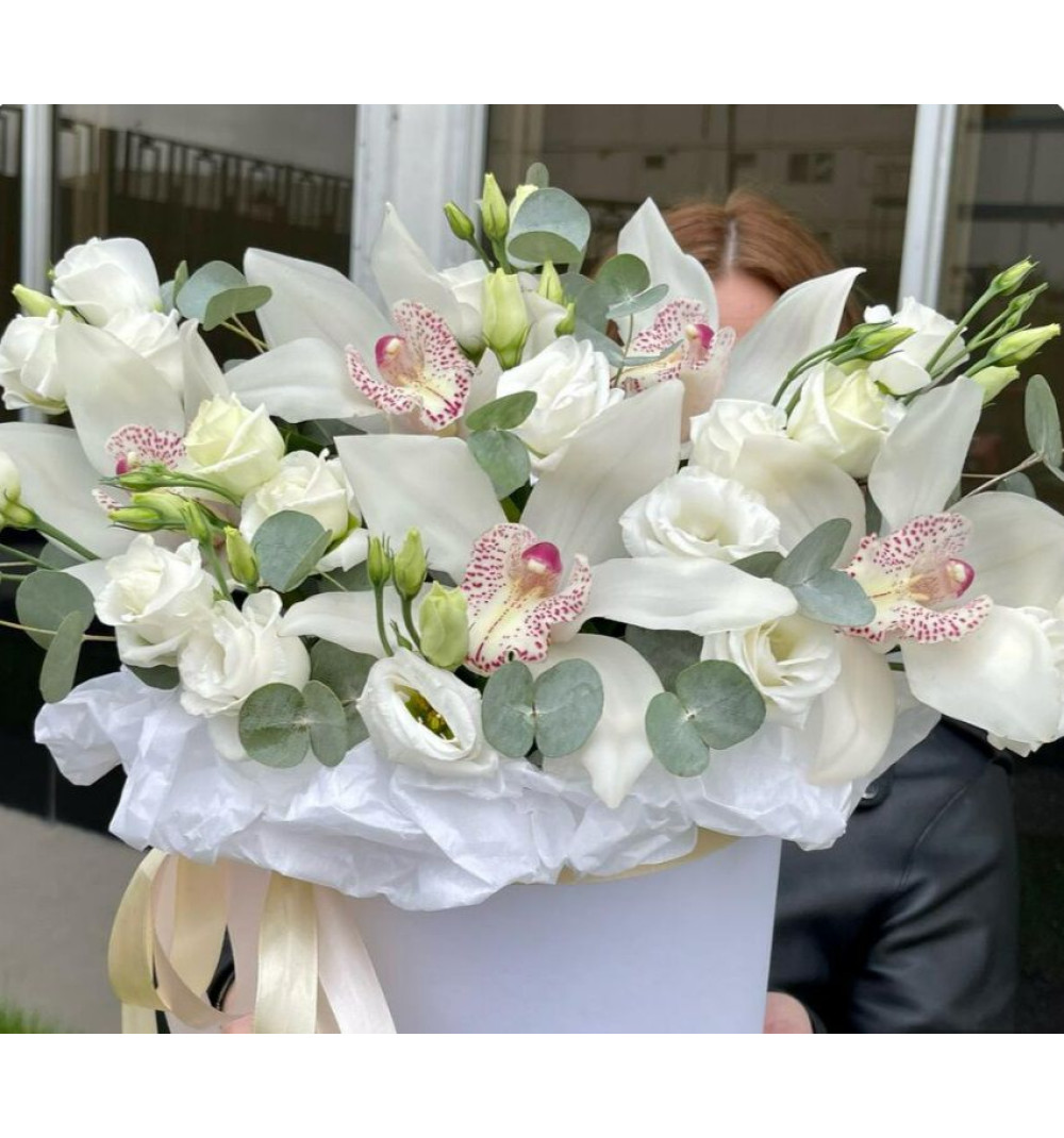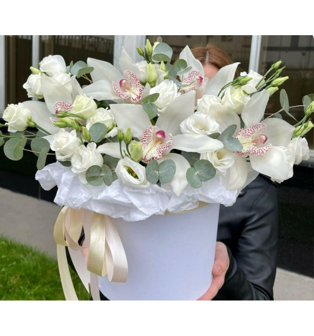 Купить Орхидея белая с эустомой в коробочке в Есиле за 25 000 ₸ | интернет-магазин «Guls»